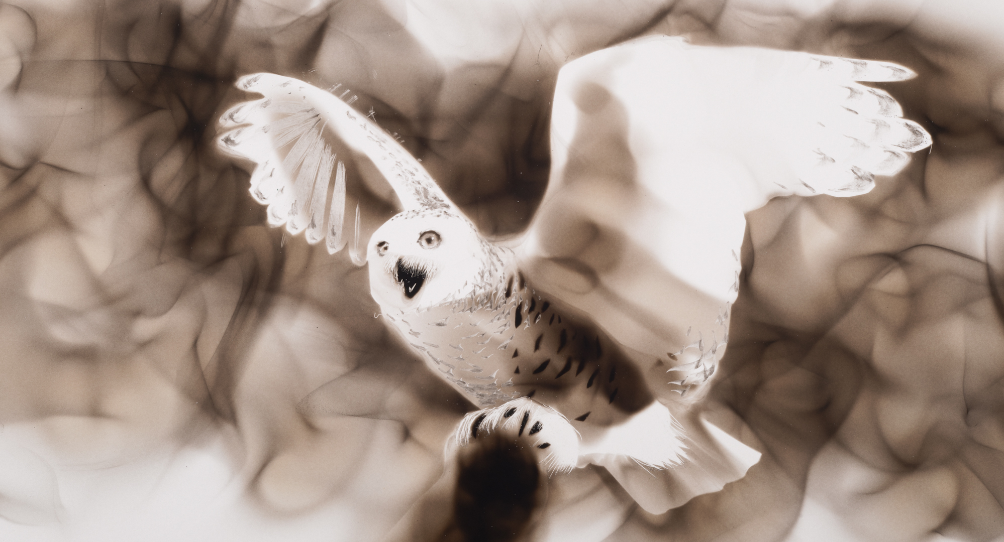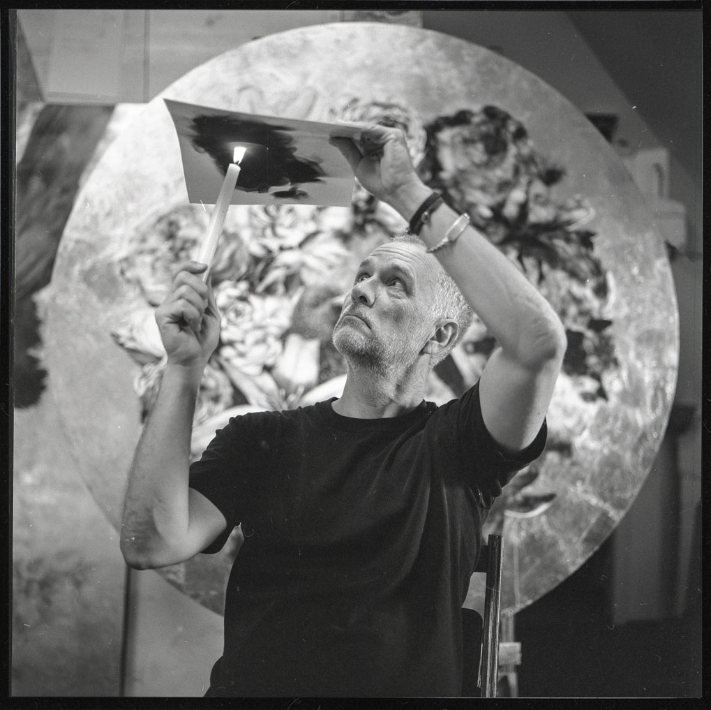 “Fumage” is an artistic technique developed in the 1930s by surrealist painter Wolfgang Paalen. It consists of moving a candle flame close to a surface (cardstock, paper or freshly painted canvas) to deposit a layer of soot. The smoke gives rise to random shapes and shades of grey. The artist then uses various implements, such as precision knife blades, brushes or feathers, to define edges, brighten certain areas or shape textures. With an artistic lineage that can be traced to surrealist experimentation and automatic drawing, the technique blends chance, intuition and technical skill.